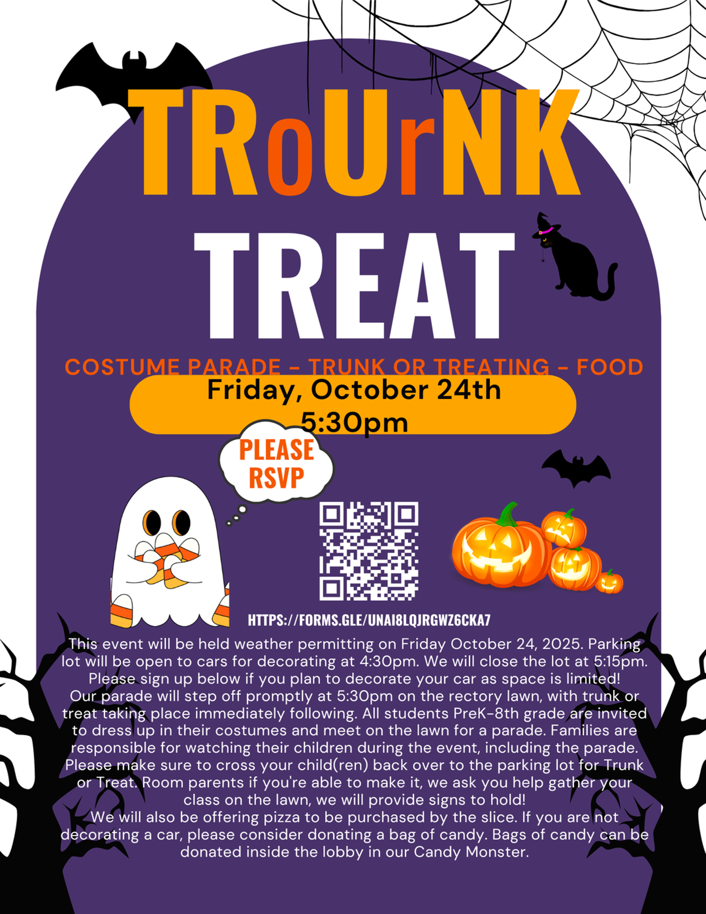 Back to All Events Trunk or Treat Friday, October 24, 2025 4:30 PM 8:00 PM Google Calendar ICS Join us for a night of Halloween fun! Dress up, decorate your trunk, and enjoy treats with MCS friends and families. Space is limited, so sign up early if you’d like to decorate a car.