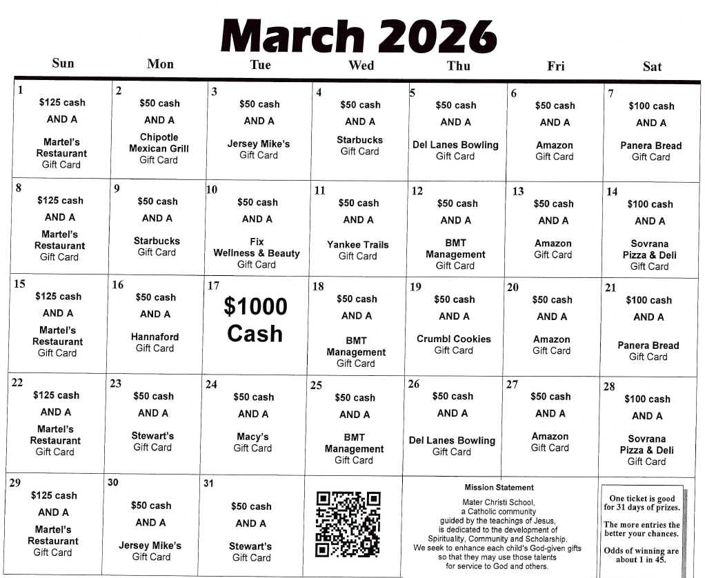Each day in March a name will be randomly selected, and the winner will receive the daily prize shown for that calendar date. There is a $1,000 cash prize on St. Patrick’s Day!! Winning tickets will be placed back into the raffle for more chances to win!